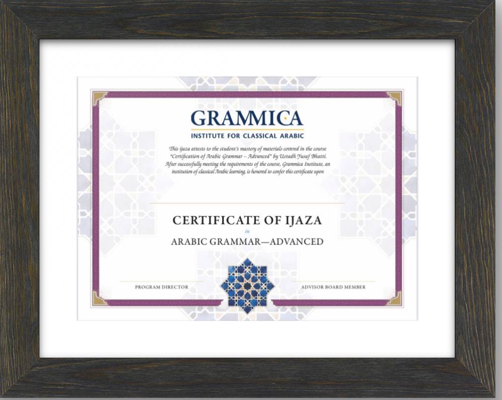 Couriered to your doorstep at no extra charge, your framed certificate will handsomely adorn your office or study for years to come as a continuing endorsement of our confidence in your abilities. Custom-mounted and framed by hand, this beautiful certificate was designed by classically-trained Islamic artists. We share your excitement in seeing your certificate get to you as soon as possible, and appreciate your patience as we prepare this handcrafted artwork.